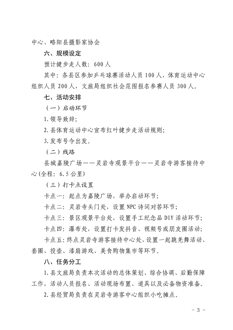 | 内容概述 | 略阳县文化和旅游局略阳县举办第二届“游灵岩栈道·赏嘉陵红叶”健步走暨第二十九届“汉水情(略阳站)乒乓球联谊赛”活动方案 | ||||