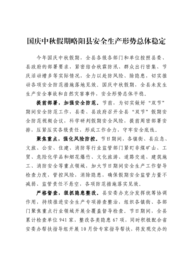 国庆中秋假期略阳县安全生产形势总体稳定
