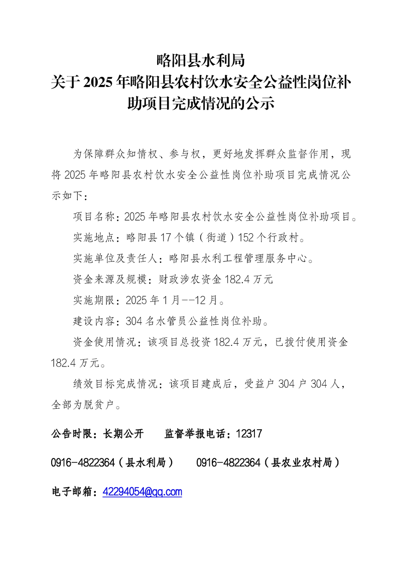 略阳县水利局2025年略阳县农村饮水安全公益性岗位补助项目完成情况的公告