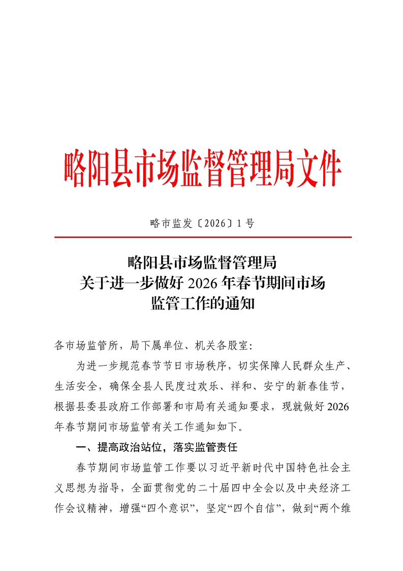 略阳县市场监督管理局关于进一步做好2026年春节期间市场监管工作的通知
