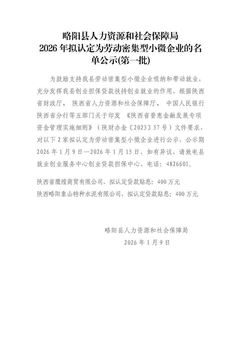 略阳县人力资源和社会保障局2026年拟认定为劳动密集型小微企业的名单公示(第一批)