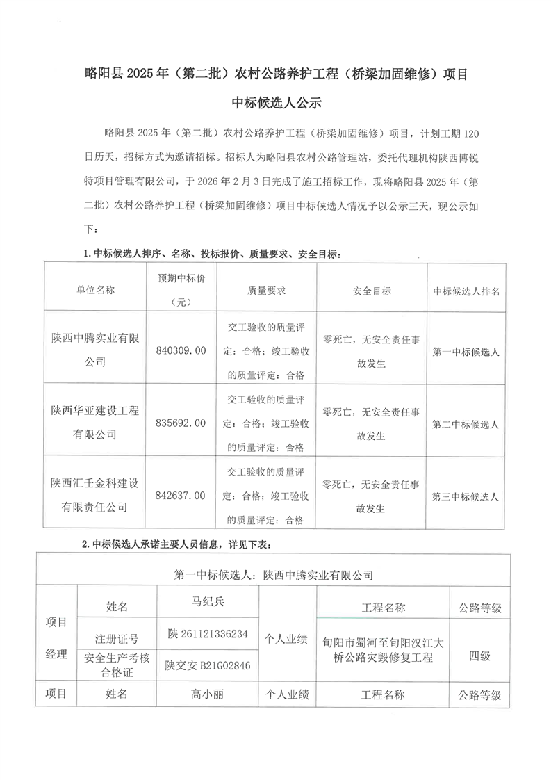 | 内容概述 | 略阳县2025年(第二批)农村公路养护工程(桥梁加固维修)项目中标候选人公示 | ||||