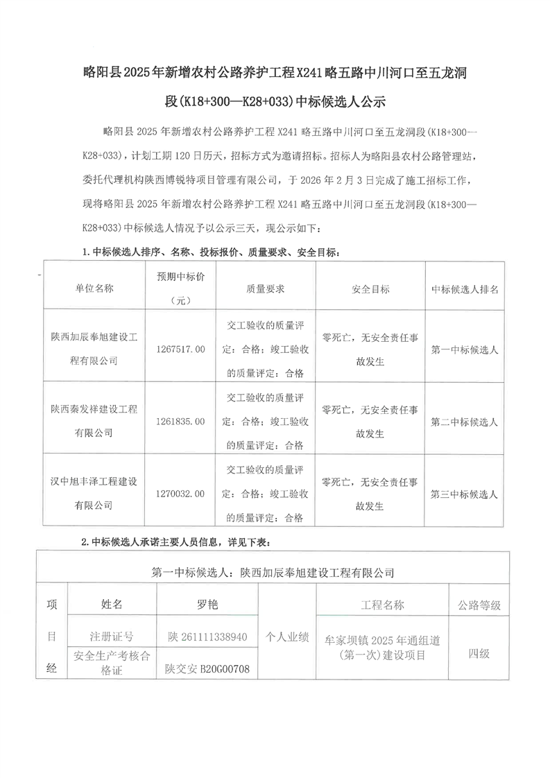 | 内容概述 | 略阳县2025年新增农村公路养护工程X241略五路中川河口至五龙洞段(K18+300—K28+033)中标候选人公示 | ||||
