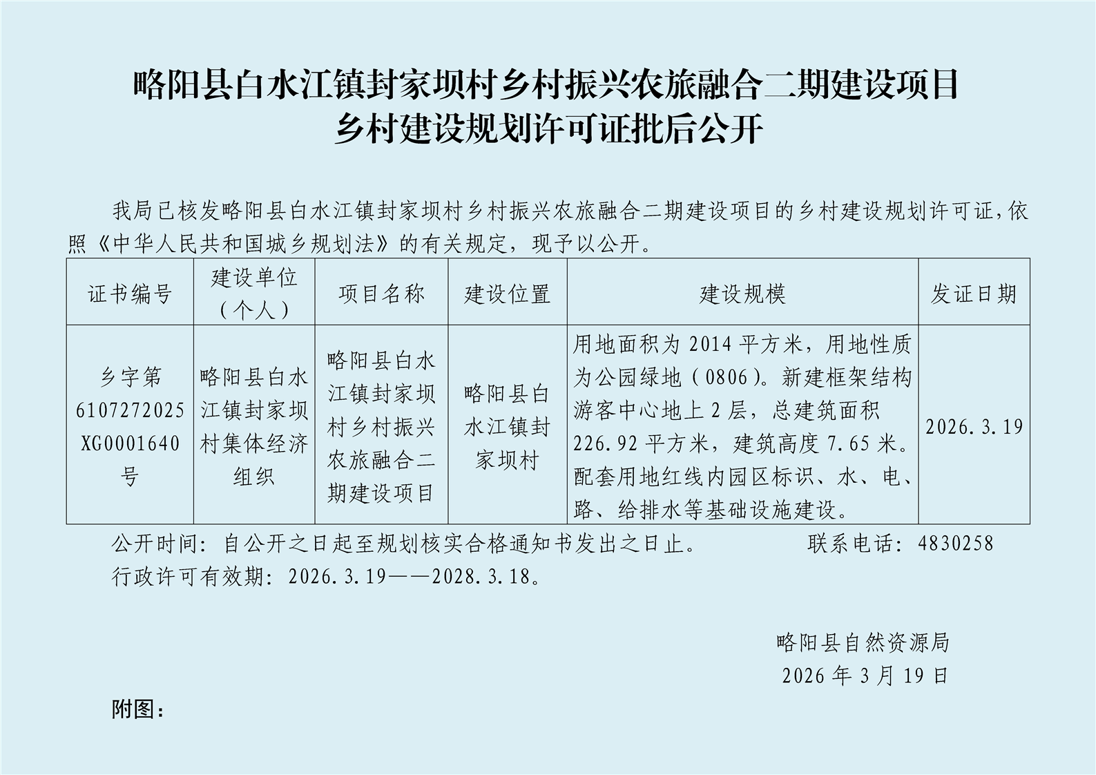 | 内容概述 | 略阳县白水江镇封家坝村乡村振兴农旅融合二期建设项目乡村建设规划许可批后公开 | ||||