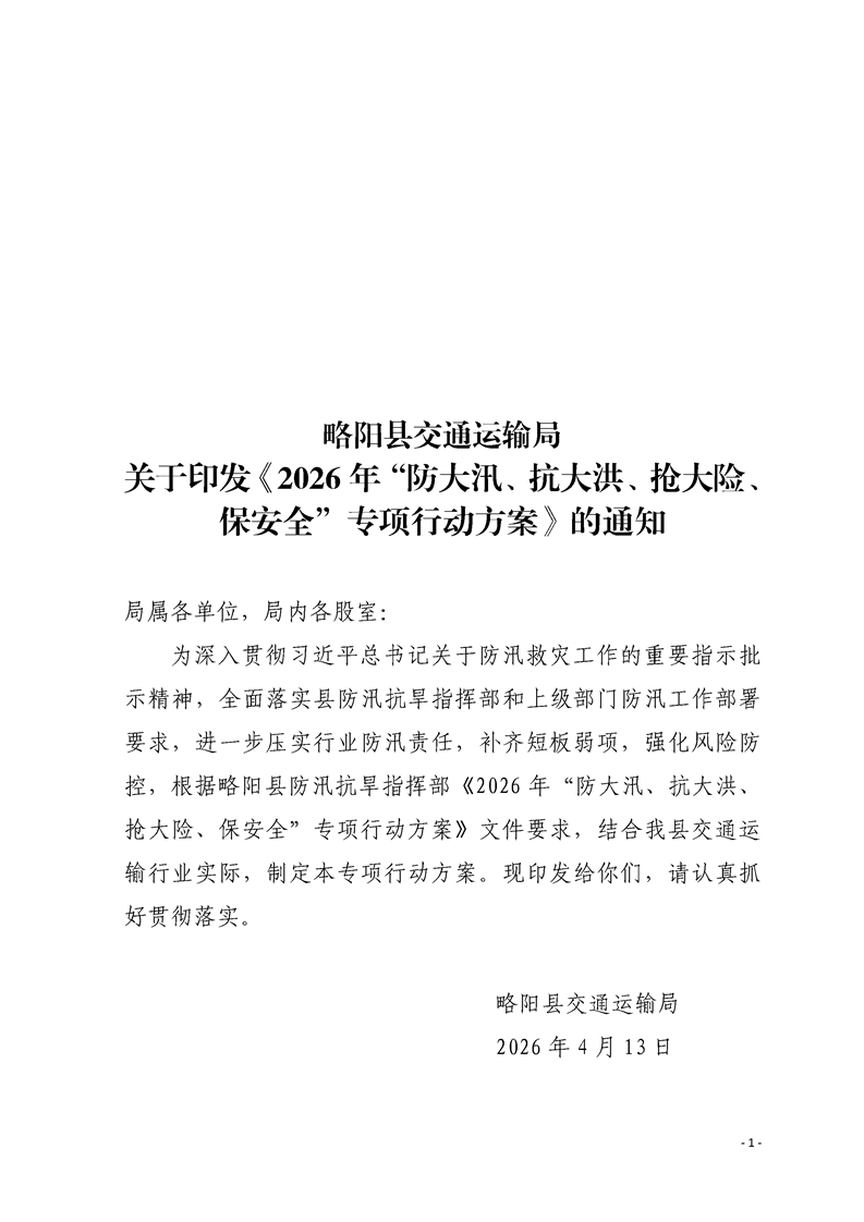 | 内容概述 | 略阳县交通运输局关于印发《2026年“防大汛、抗大洪、抢大险、保安全”专项行动方案》的通知 | ||||