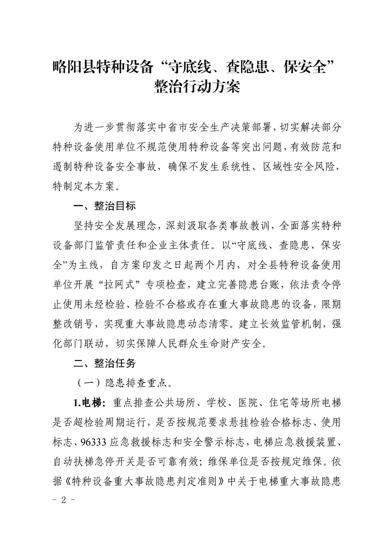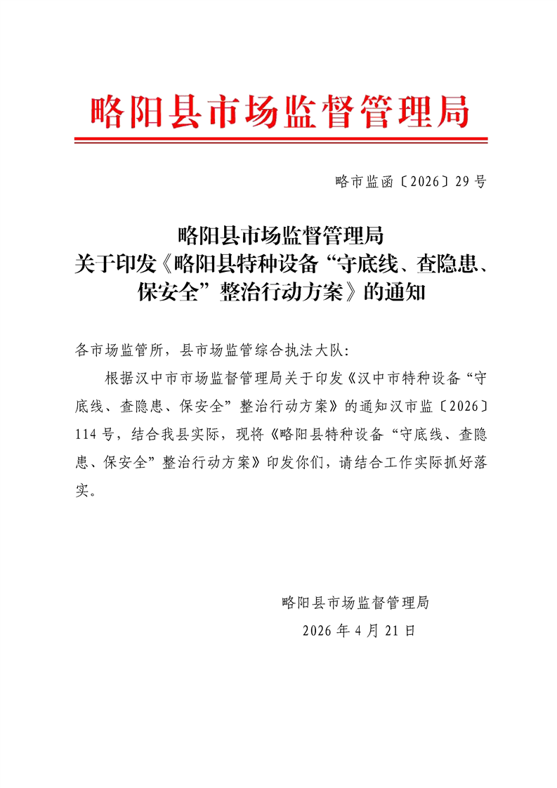 略阳县市场监督管理局关于印发《略阳县特种设备“守底线、查隐患、保安全”整治行动方案》的通知