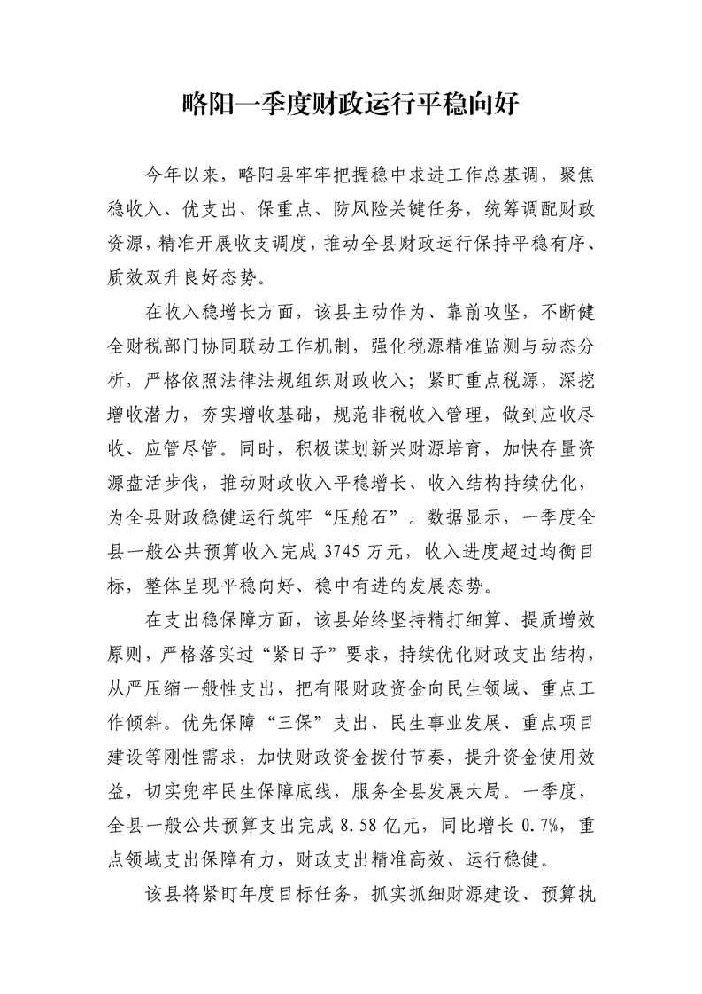 略阳一季度财政运行平稳向好