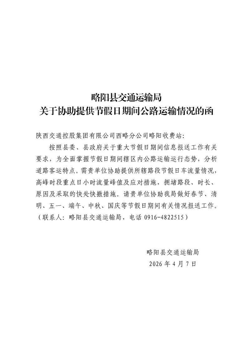 略阳县交通运输局关于协助提供节假日期间公路运输情况的函